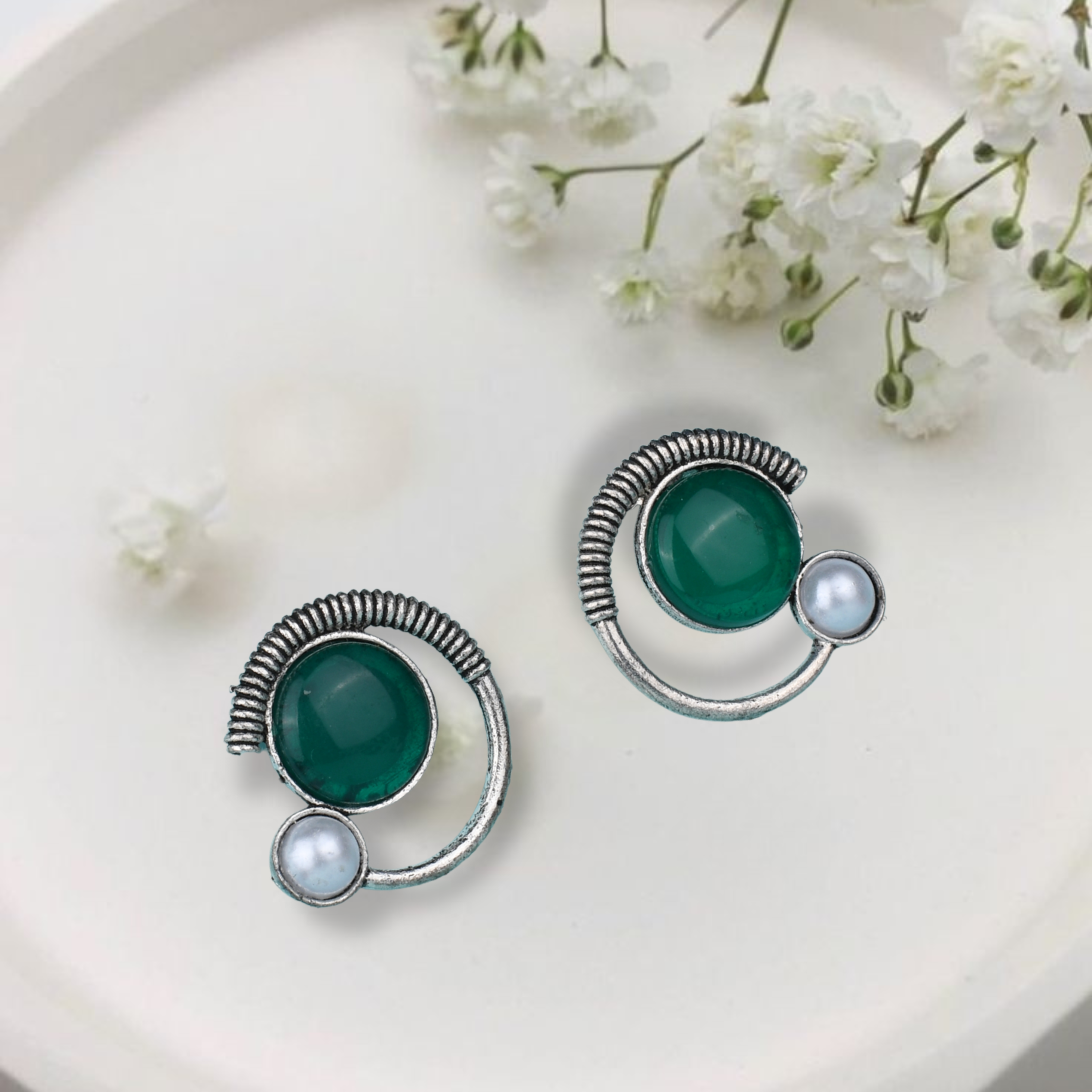 4. Emerald Aura Studs - Dual-stone green studs with pearls, perfect for simple traditional wear or office festive days.